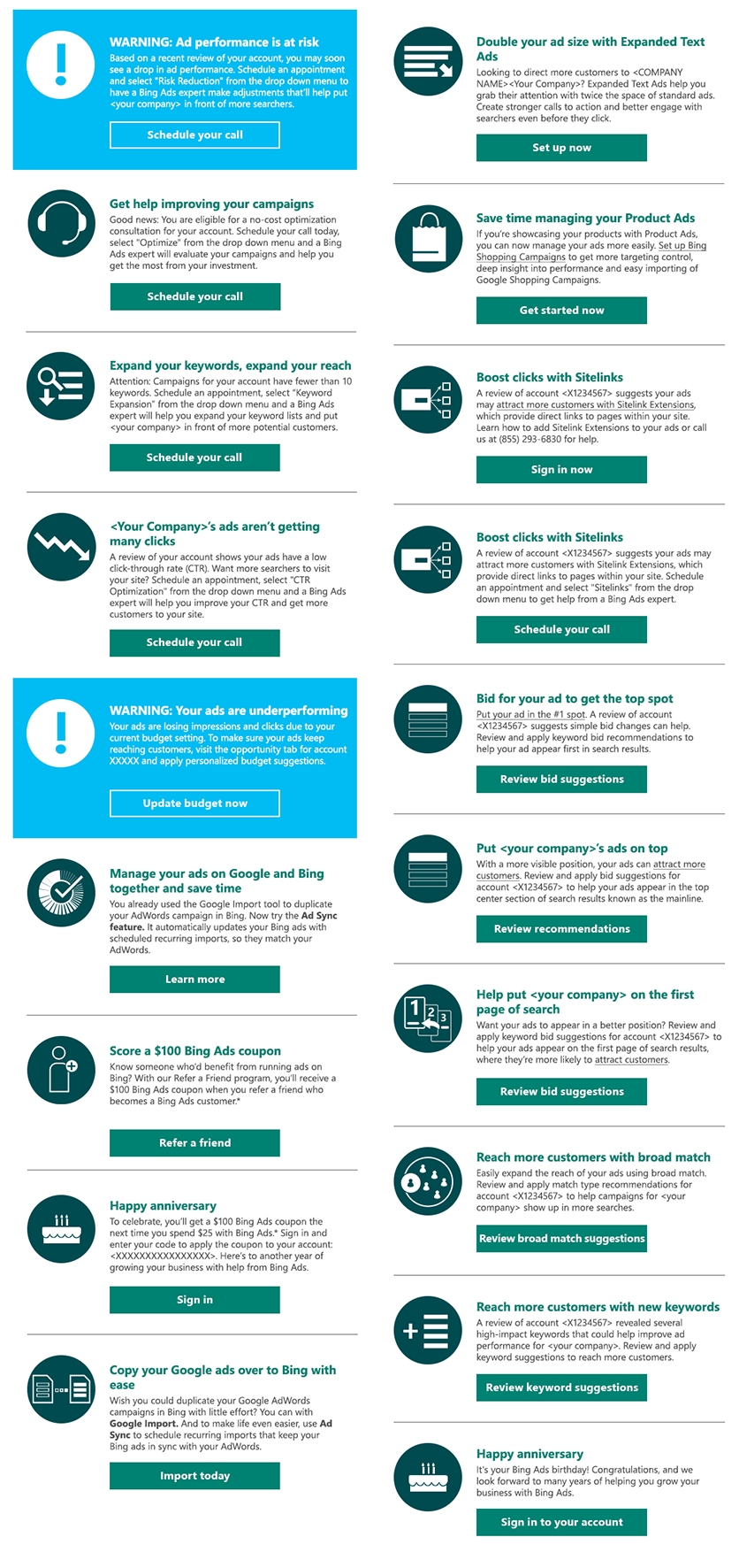 Bing had a problem over-communicating to customers without sharing much that was relevant. Our solution: Bing Ads Dash. This monthly email program leverages user data and an innovative dynamic tile design to share performance metrics, specific ways to optimize their campaigns and even account milestones. Each email is now more relevant and engagement skyrocketed. More importantly, this approach became the standard for all Bing email programs.
