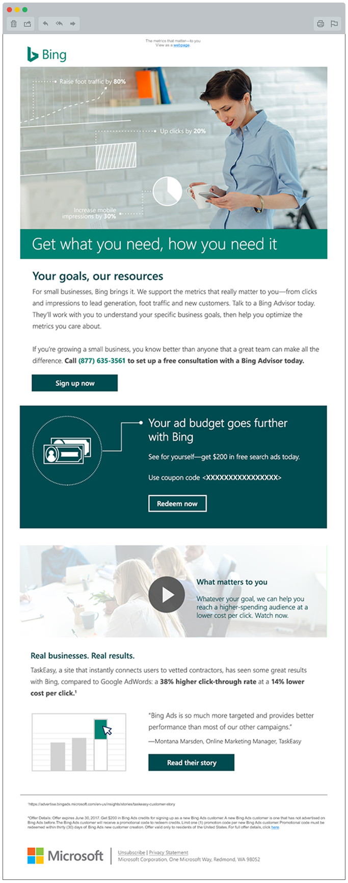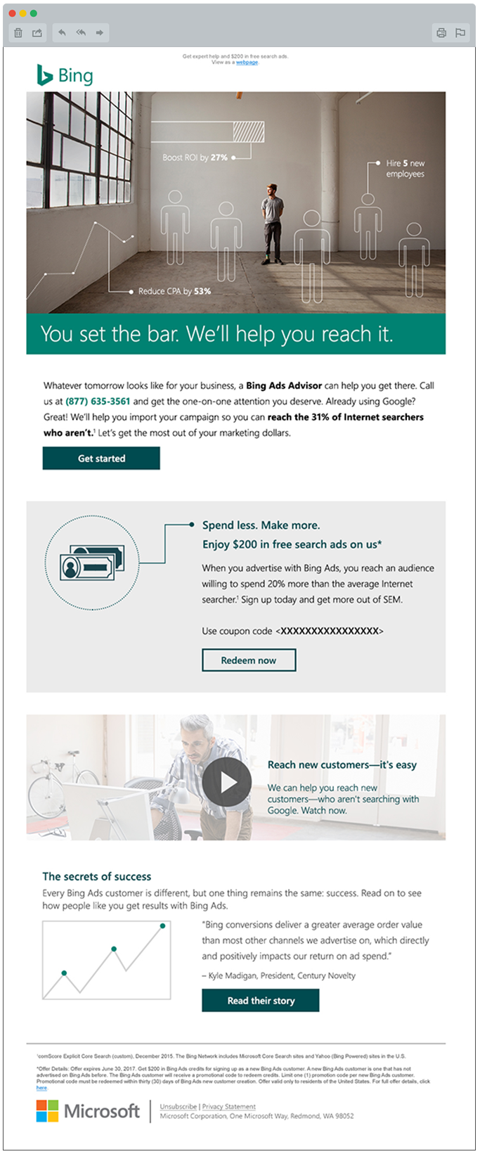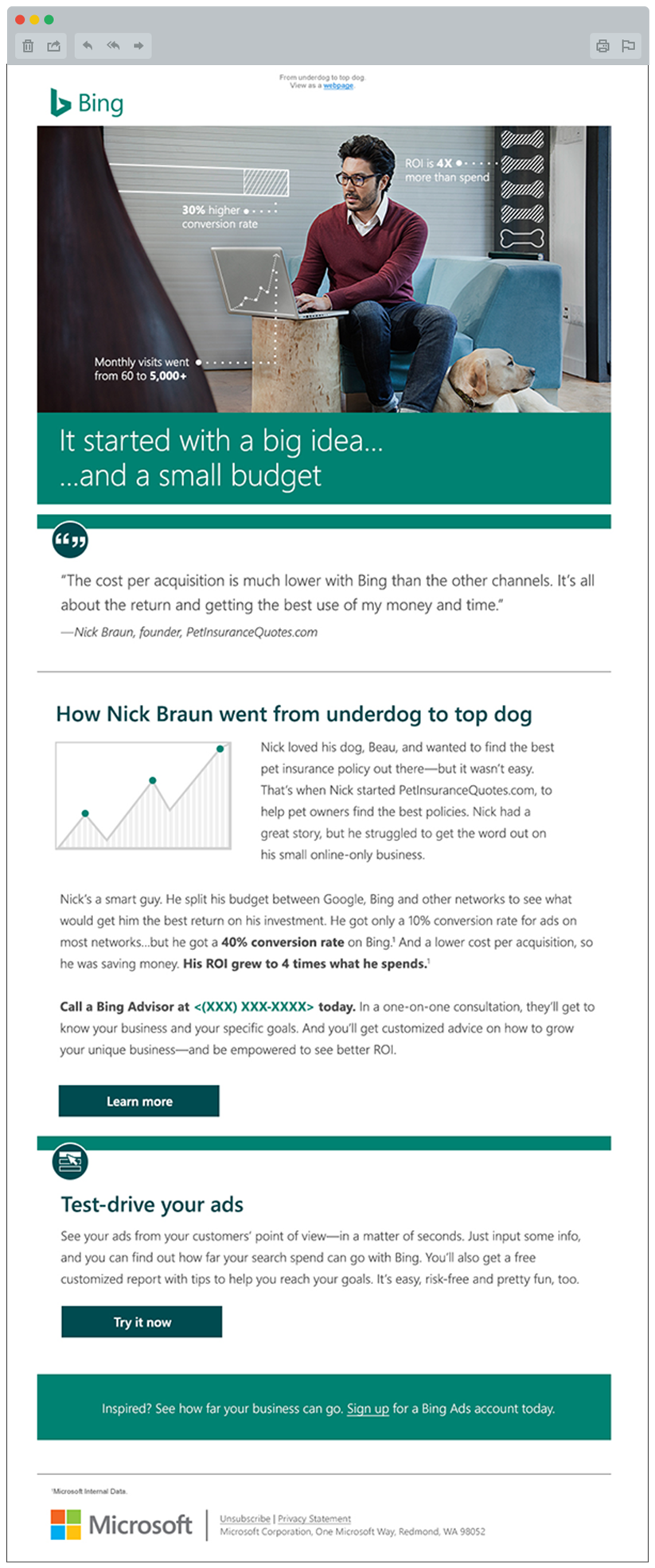 When Bing came to us to help rethink their acquisition program, we started with the audience. We found they engaged with facts and figures, but had limited time, limited budgets and little SEM experience. With new insights in hand, we created a campaign that was straightforward and inspirational. We used a graphic treatment to humanize the all-important data. And we created a series of videos to share useful insights and customer stories with our on-the-go audience. Initially, our approach was a stretch for the brand police, but ended up influencing their new guidelines (a tricky task in the world of Bing).