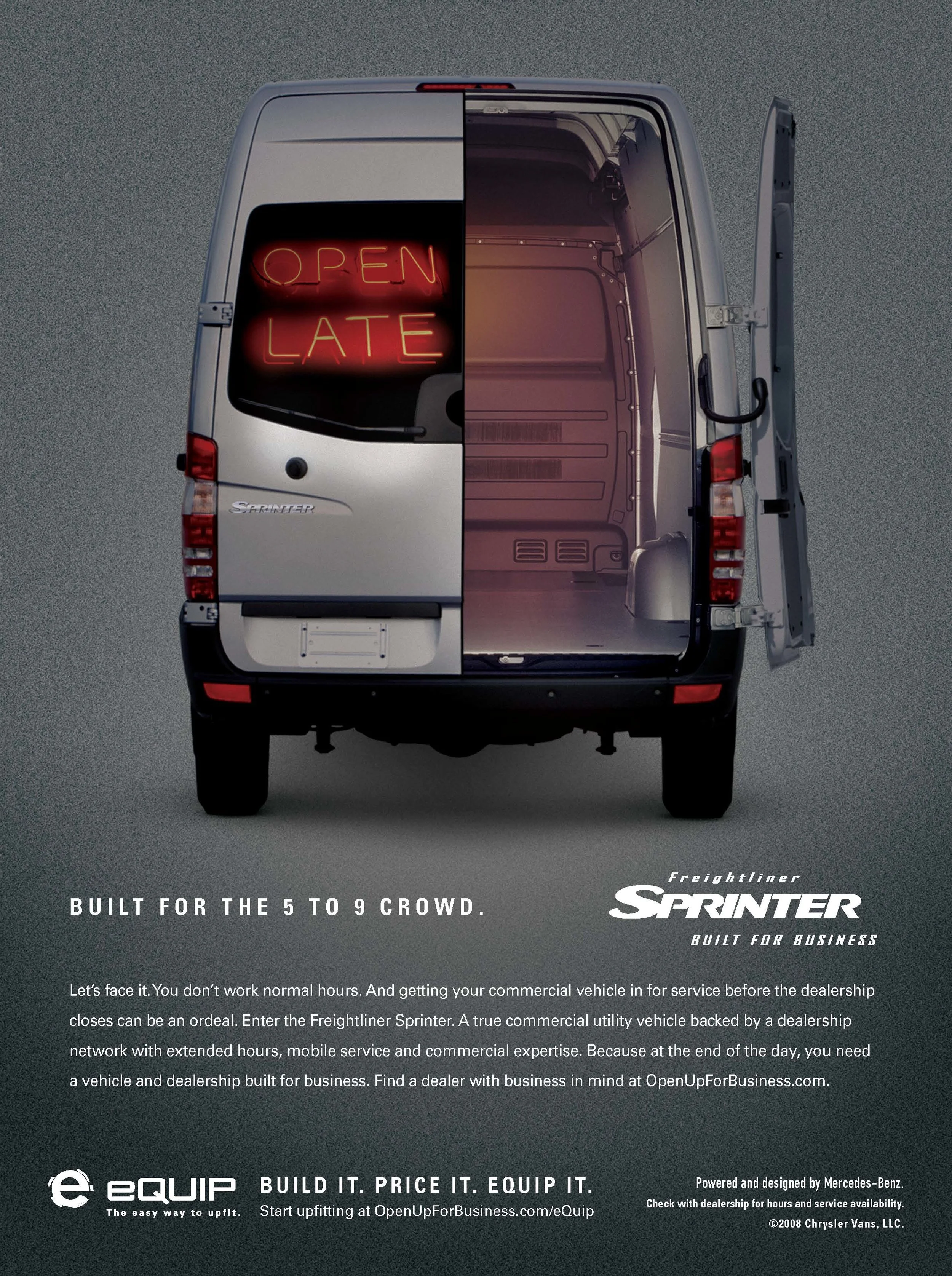 Small-business owners are hard-working folks who don't want a glorified conversion van for a work vehicle. Once we landed on the "Built for Business" platform, we positioned the Freightliner Sprinter as an essential tool that's as serious about hard work as the owners are.